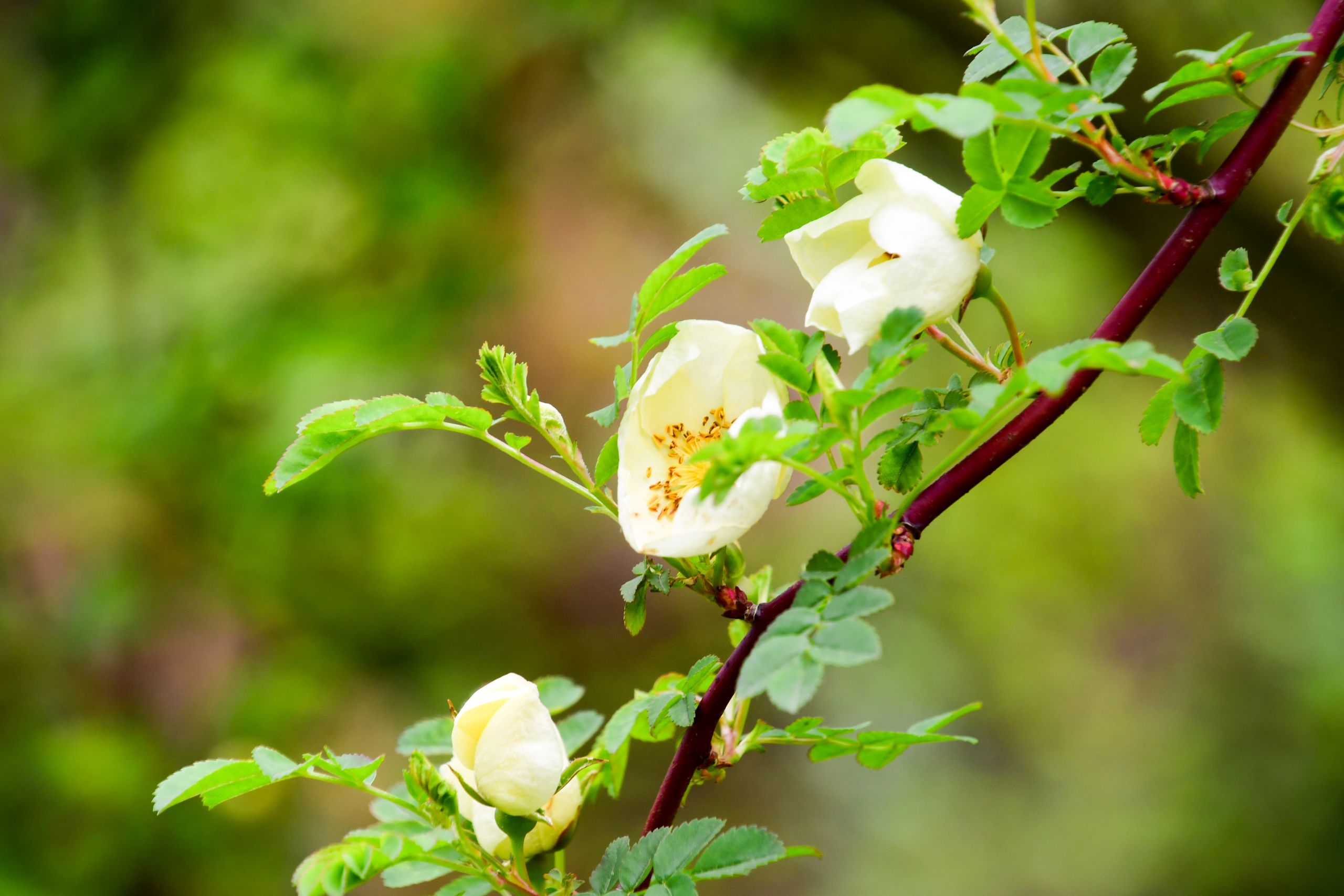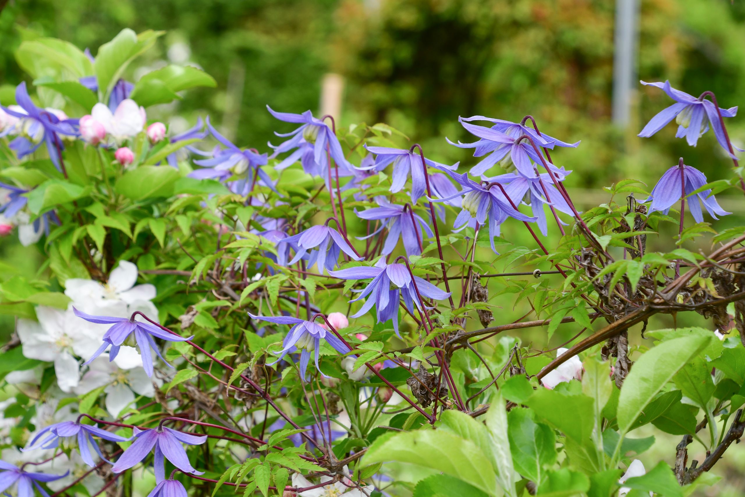 Die ersten Rambler in den Bäumen, auf den Dächern und an den Pavillonen zeigen erste Blüten. Vor allem „Scarman´s Himalayan Musk„ . Aber auch die unübertroffene „Rosa richardii„ öffnet die ersten Blüten. Im Blütenrausch bereits „Nevada„.